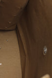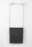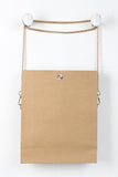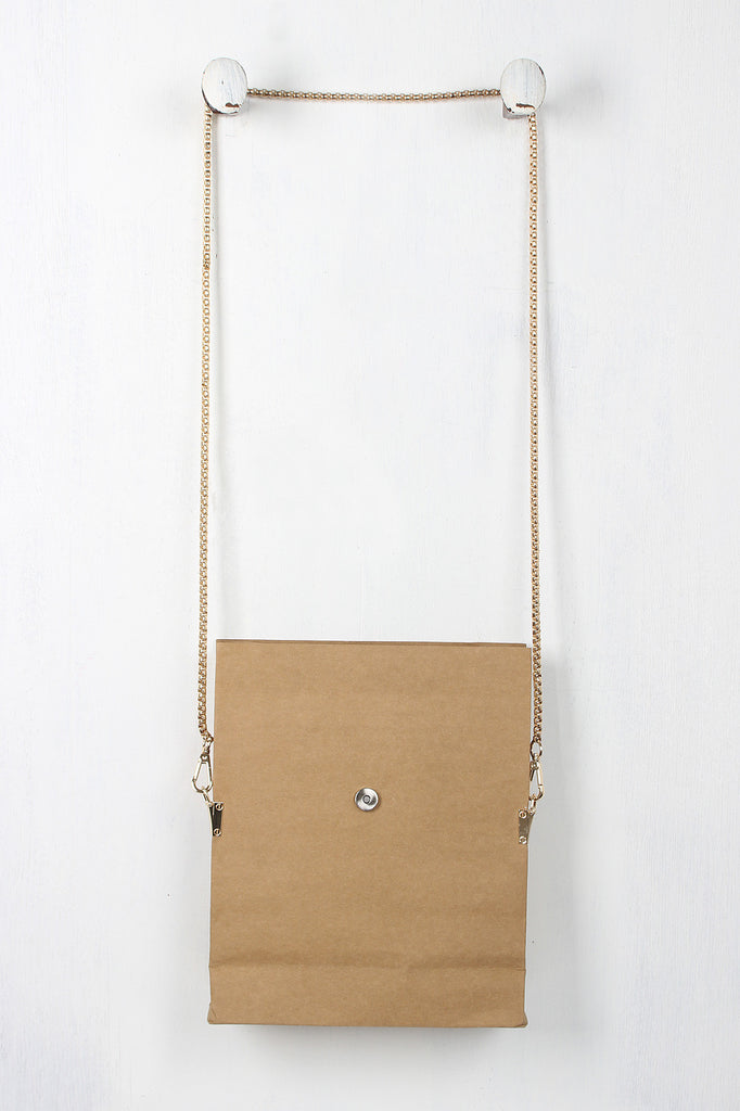 This bag features a structured rectangular shape, paper bag designed, stud details, a folded snap buckle closure, and a removable cross body chain.