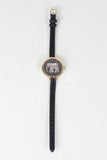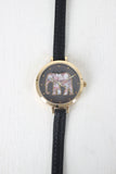 This dainty watch features a glossy round bezel, an etched elephant design, and a thin vegan leather band with adjustable buckle closure.