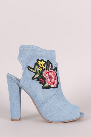 Delicious Denim Floral Patch Peep Toe Chunky Heeled Booties