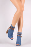 These stylish  booties  feature a peep toe silhouette, denim upper with wrapped around buckles accent, exposed back, and chunky stacked heel. Finished with a cushioned insole and side zipper closure for easy on/off.