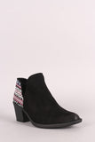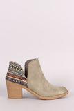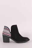 These chic  booties  feature an almond toe silhouette, side cutout design, tribal print back panel, and chunky stacked heel. Finished with a cushioned insole and easy pull-on construction.