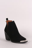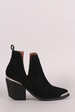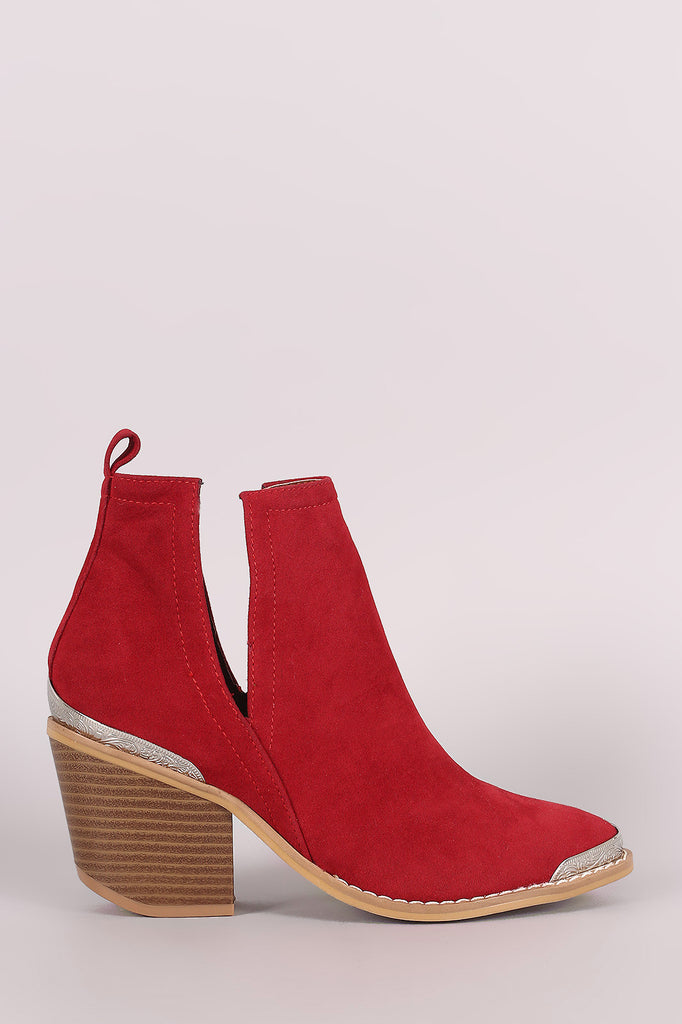 These western inspired  booties  feature a pointy toe silhouette, embossed metal rand, side cutout design, and chunky stacked heel. Finished with a cushioned insole and easy pull-on construction.