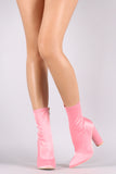 These stylish  boots  feature a smooth satin upper, pointy toe silhouette, and chunky round heel. Finished with a cushioned insole and side zipper closure.