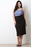 This plus size skirt features stretch knit, ruffle detail at waist, pencil cut, front slit, and midi-length. Finished with a side zipper closure and a self-tie waist sash with belt loops. Accessories sold separately. 95% Polyester, 5% Spandex.