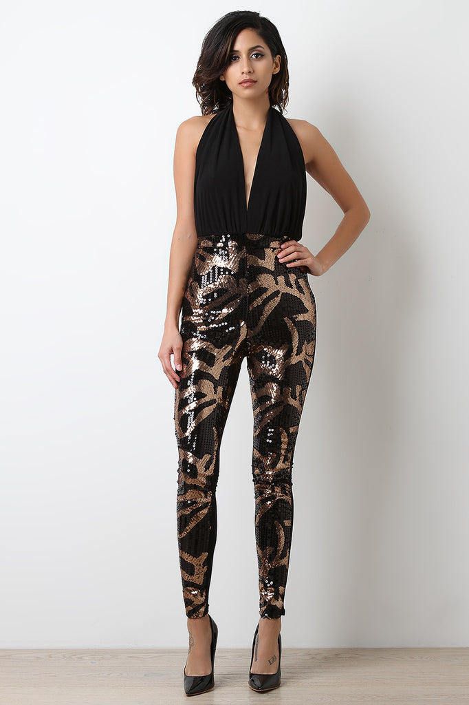 This sexy jumpsuit features a stretchy fabrication, a halter neckline with a plunging front, sleeveless construction, an open back design, and taper cut legs with sequins designs. Accessory sold separately. Made in U.S.A. 95% Polyester, 5% Spandex.