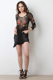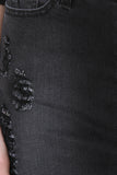 This denim jean skirt features distress accents, diagonal mini length hem, classic 5-pockets, belt loops, zipper fly, and single button. Accessory sold separately. Made in U.S.A. 65% Cotton, 25 1% Spandex, 4% Viscose, 2% Spandex.