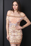 This dress features an off-the-shoulder neckline, short sleeves, fleur de lis pattern design, and ribbed knit sculpture fabric. Accessory sold separately. 100% Polyester.