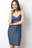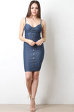 This dress features a stretchy denim jean fabrication, bustier padded cups design, adjustable spaghetti shoulder straps, cinched waist panel seam, button-up d�cor, and back zipper. Accessory sold separately. 25% Polyester, 70% Cotton, 5% Spandex.