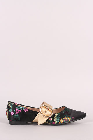 Embroidered Floral Satin Pointy Toe Mary Jane Flat