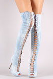 These striking  over the knee boots  feature a peep toe silhouette, lace up front design, low platform, and wrapped stiletto heel. Finished with cushioned insole, smooth lining, and full-length rear zipper closure.