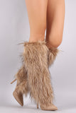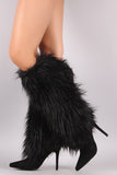 These stylish  pointy toe  silhouette, long faux fur shaft design, and wrapped stiletto heel. Finished with a cushioned insole, smooth lining, and full-length side zipper closure.