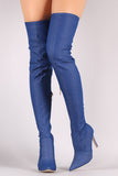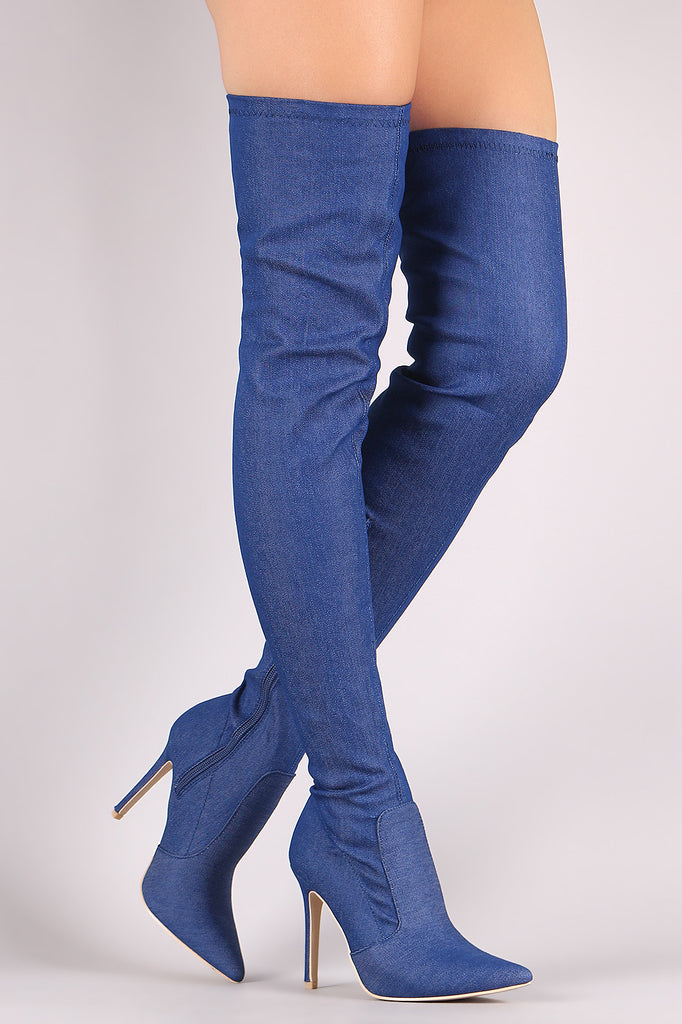 These  over-the-knee boots  feature a pointy toe silhouette, wrapped stiletto heel, and cushioned insole for comfort. Pull-on construction with partial side zipper closure for easy on/off.
