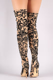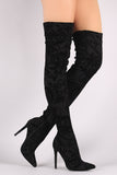 These stylish  boots  feature a stretchy mesh underlay with an intricate fleur-de-lis patterned detailing, pointy toe silhouette, and wrapped stiletto heel. Finished with a lightly cushioned insole and partial side zipper closure for easy on/off.