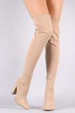 These  over-the-knee boots  feature a slightly stretched elastane shaft, covered chunky heel, pointed toe, and easy pull-on construction. Cushioned insole for comfort.