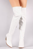 These western inspired  boots  feature a shimmery snake embossed PVC upper with elastic gusset insert, pointy toe silhouette, and chunky stacked heel. Finished with a cushioned insole and partial side zipper closure for easy on/off.