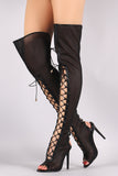 These  over-the-knee boots  feature a peep toe silhouette, netted mesh upper with vegan leather trim, and corseting lace-up design at front/back. Finished with a lightly cushioned insole and wrapped stiletto heel.
