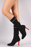 These cozy  boots  feature a stretchy ribbed knit fabrication with stripe detail, almond toe silhouette, and contrast oval heel. Finished with a cushioned insole and pull-on construction.