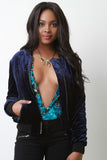 This bomber jacket features a velvet fabrication, contrast rib knit trim, padded design, exposed metal zipper closure, front zipper pockets, fully lined. Accessories sold separately. Shell: 100% Polyester. Lining: 100% Polyester.