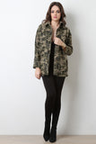 This distress camouflage jacket features a button-up front, collar neckline, long sleeves, and square breast pockets. Accessory sold separately. Made in U.S.A. 99% Cotton, 2% Spandex.