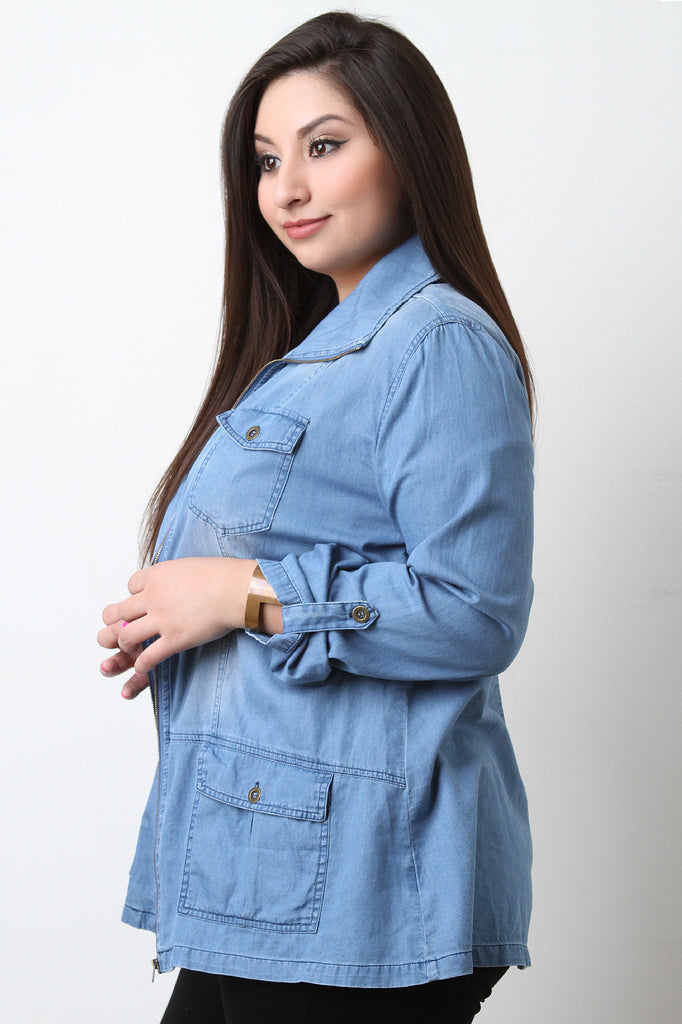 This plus size jacket features a lightweight washed denim fabrication, collar neckline, long sleeves with tabs, and two pouch pockets. Finished with a single chest pocket and a zipper front closure. Accessories sold separately. 100% Cotton.