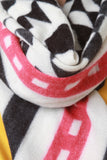 This cozy scarf features a gauze like woven fabrication, frayed edges, bold print and over-sized blanket scarf design.